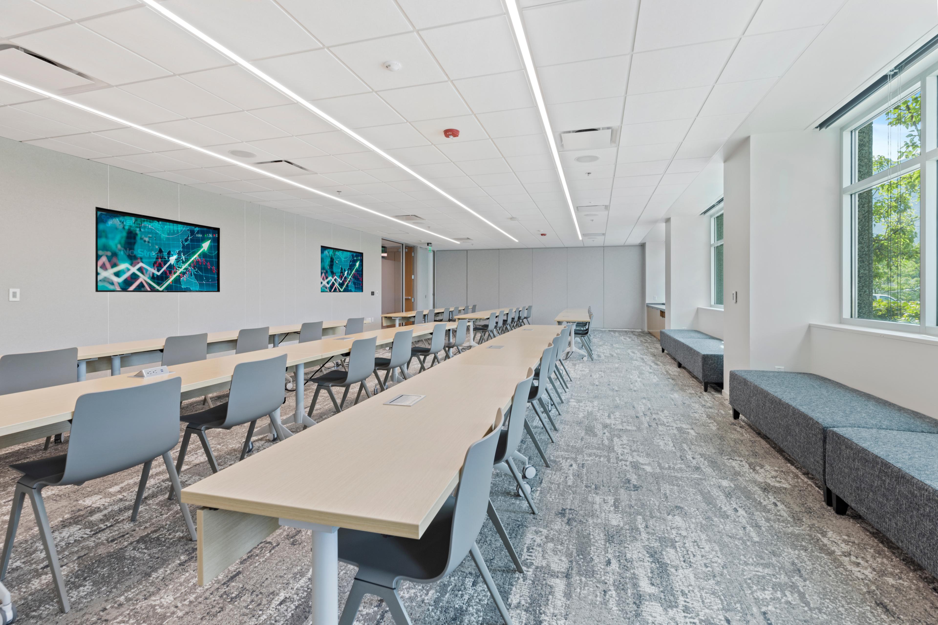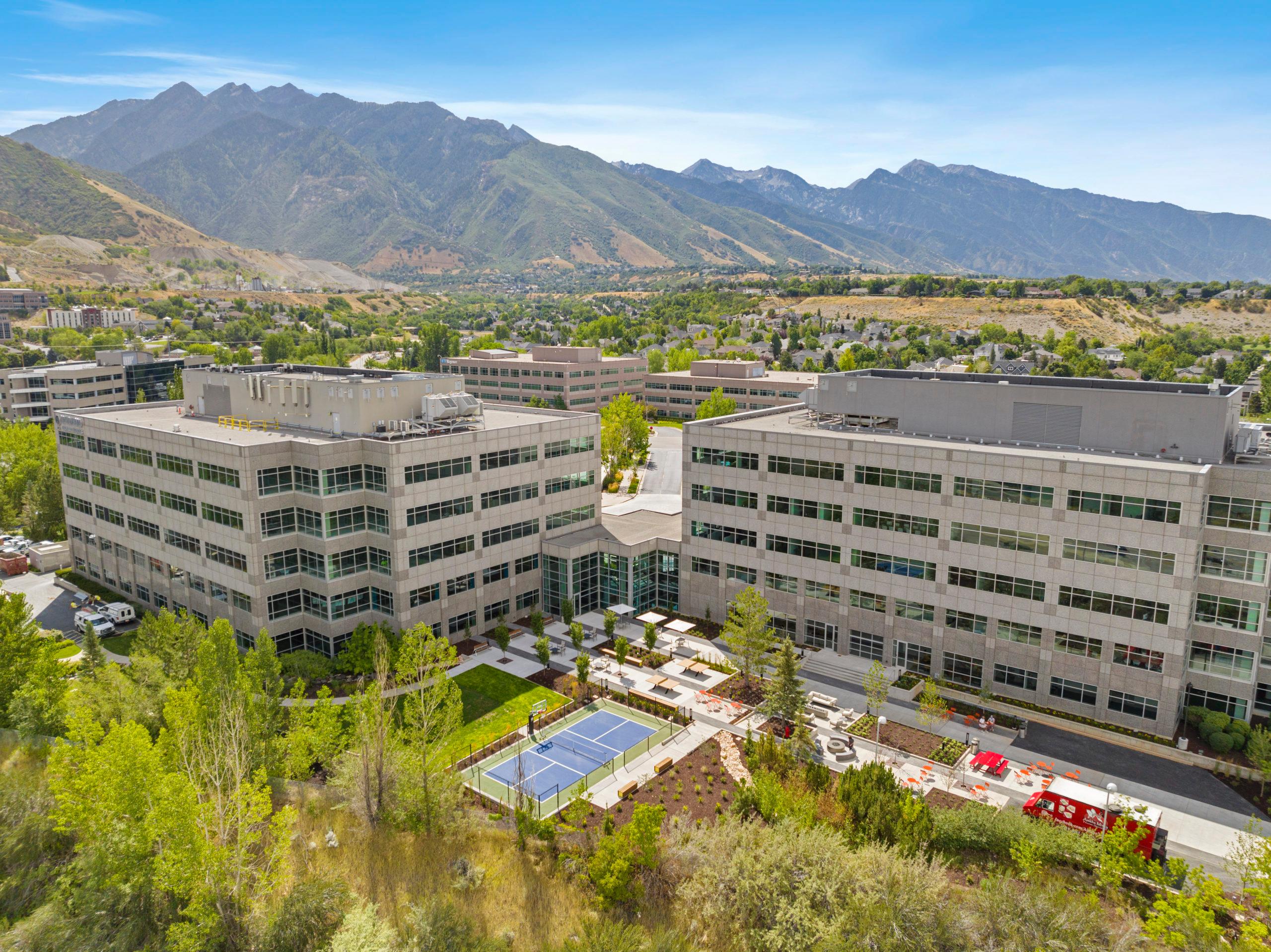 This project was for the construction of multiple tenant amenities at the Cottonwood Corporate Center office complex. The work took place in buildings 9 and 10 of the Center and included interior and exterior improvements. In Building 9, interior renovations were completed to create a new coffee bar and lounge area and a game lounge. A new dedicated Conference Center was built in Building 10 that features a folding door that enables the room to be subdivided into two varying size smaller conference rooms, improving functionality for tenant companies. The exterior scope of work was for the addition of a sizeable outdoor recreation space that features seating areas with firepits, additional outdoor tables and seating, ping pong tables, and the first pickleball court built at an office complex in the state of Utah.