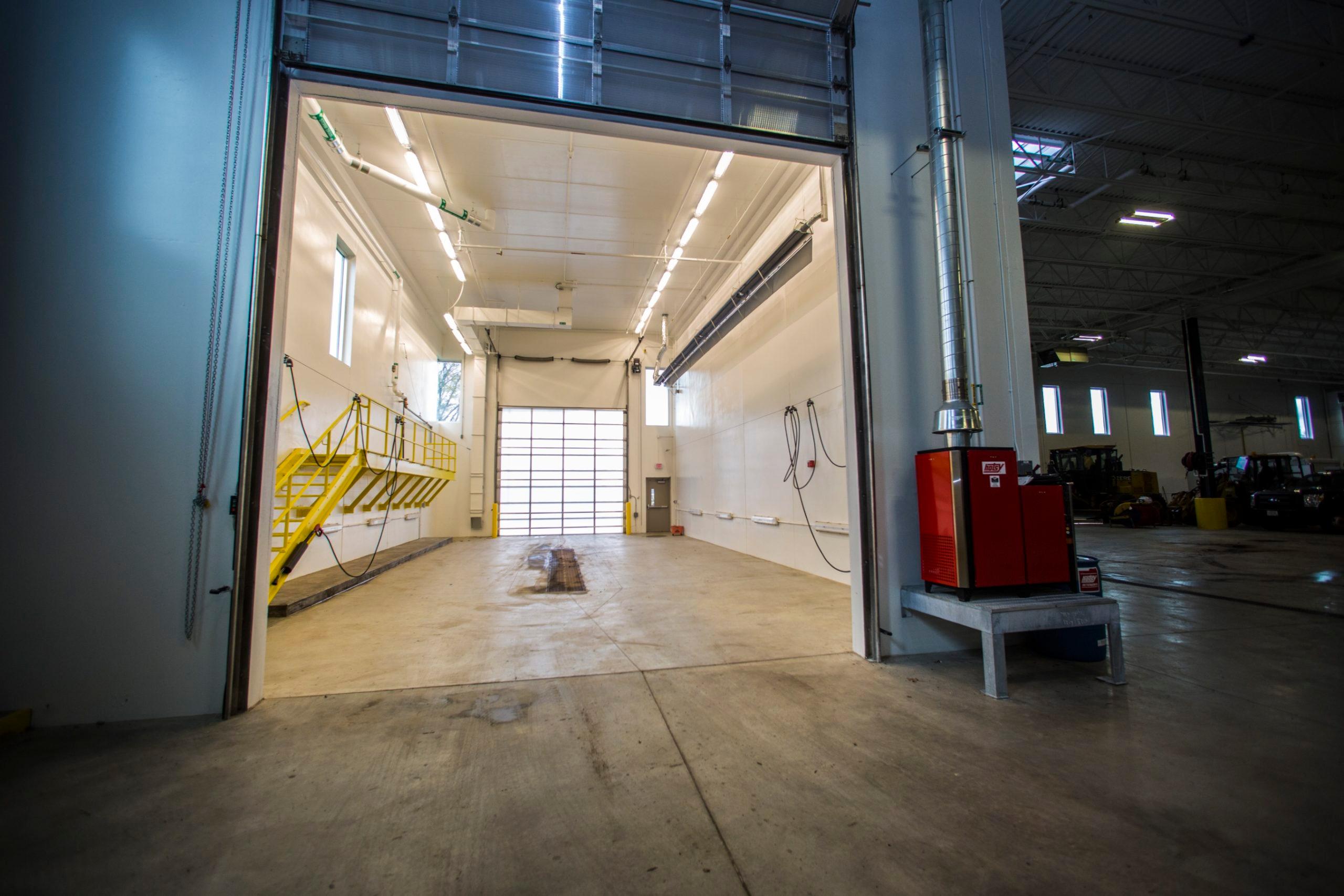 The new building features a joist and deck roof structure, a single-ply roof membrane with skylights, an energy-efficient geothermal heating system, and the street-facing elevation features a metal panel clad exterior and abundant windows. The interior features offices, locker room, conference room, training room, a large employee café / lunchroom, utility shop, 90-ft drive-through vehicle storage bays, two underhung overhead bridge cranes (2-ton and 3-ton), wash bay, vehicle hoist and high-performance roll-up doors. Construction also included storm water treatment ponds and tanks, a “brine room” to mix salt with water for salting roads, fueling station, and a multi-bay covered storage shed. The 5.3-acre site is primarily paved with asphalt and includes only minimal landscaping.