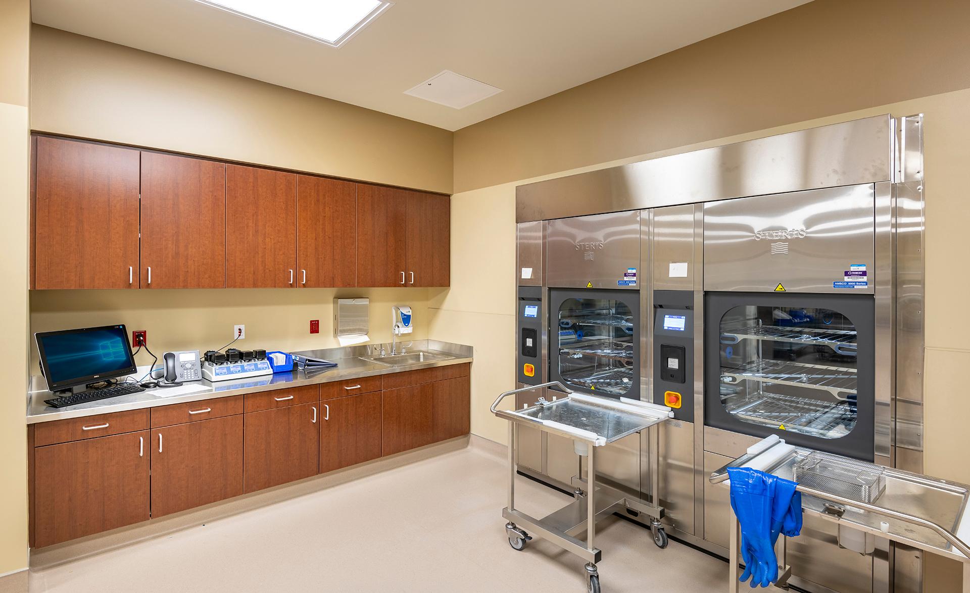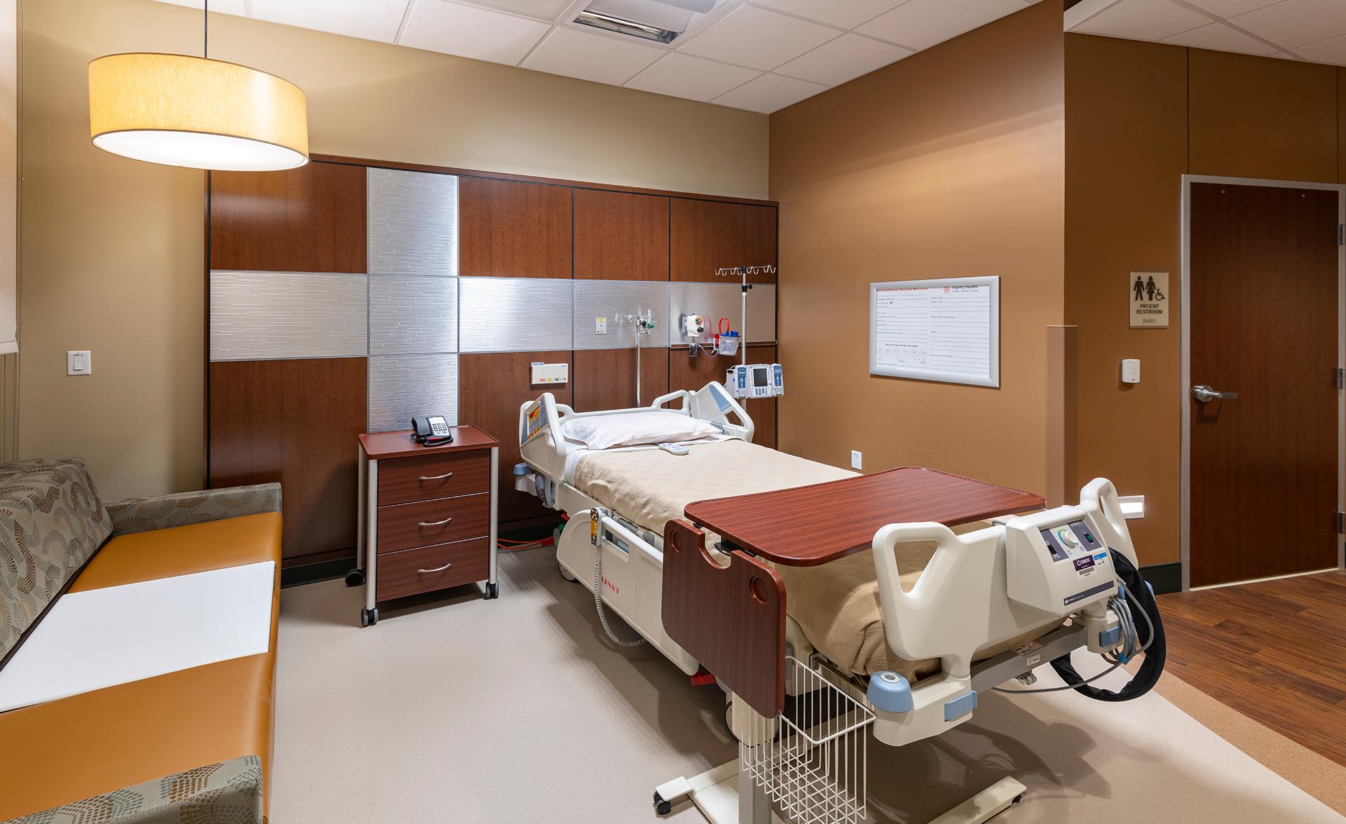 Dignity Health Arizona General Hospital in Mesa is a three-story, 94,000-sf, 50-bed hospital that was built from the ground up, using the Adeptus Hospital model in Houston, Texas. The building has a steel-frame, waterproof and fire-resistant shell with an exterior comprised of stucco, stacked stone, brick veneer, aluminum composite panels, generous glazing and roof screens. The interior features four operating rooms, a 14-bed, 24/7 emergency department, intensive care unit, pharmacy, a laboratory and radiology suite and medical offices. There is also a 279-stall surface parking lot with covered parking canopies, drought-resistant landscaping, and an adjacent helipad. Our team managed all aspects of MEP engineering including med gas connections for operating rooms and critical hook ups for Hillrom hospital beds in patient rooms.
