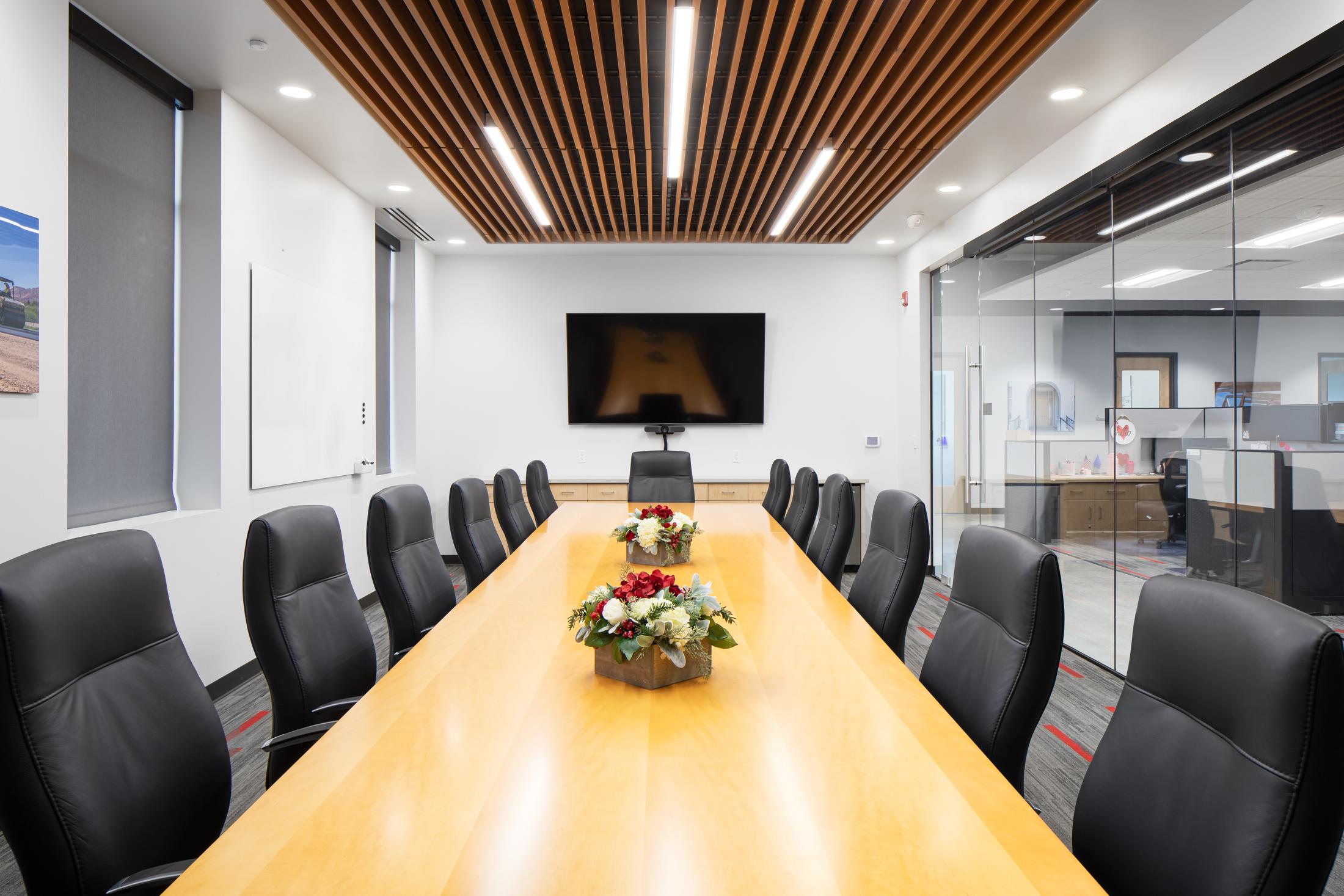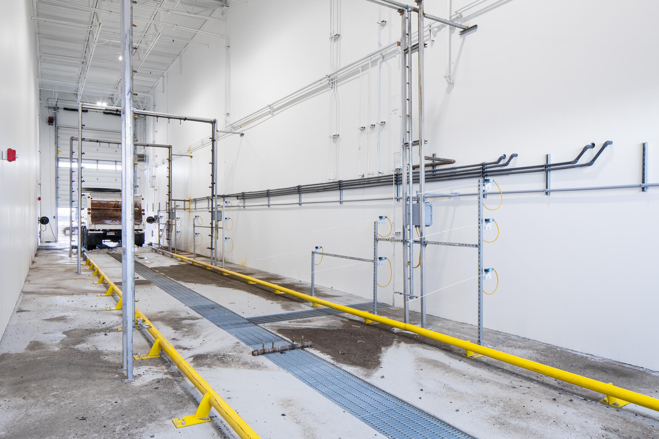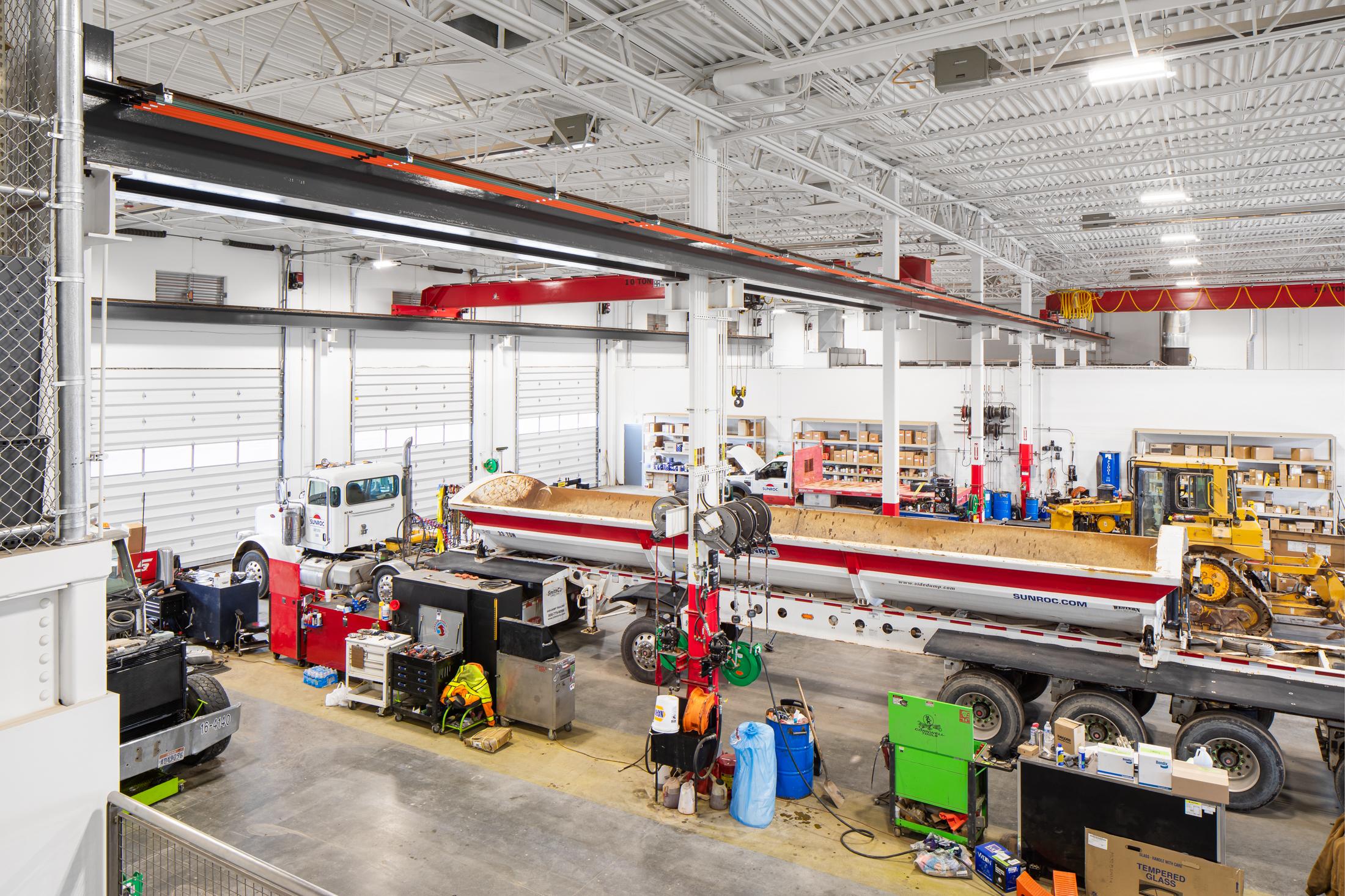 This multi-function facility houses offices for both Sunroc and Sunpro along with a large eight-bay shop. The two-story office building features a central lobby, private offices, open office space, large and small conference rooms, copy-work stations, a training room, employee break room, and support spaces. The transition area between offices and shop is also two-story, including a fitness center, extensive storage, a shop office, and dedicated shop employee break room. The approximately 23,000-square-foot shop area includes a welding shop, oil and lube bay, paint booth, and truck wash bay. Multiple pull-through bays are served by compressed air and oil and lube systems.